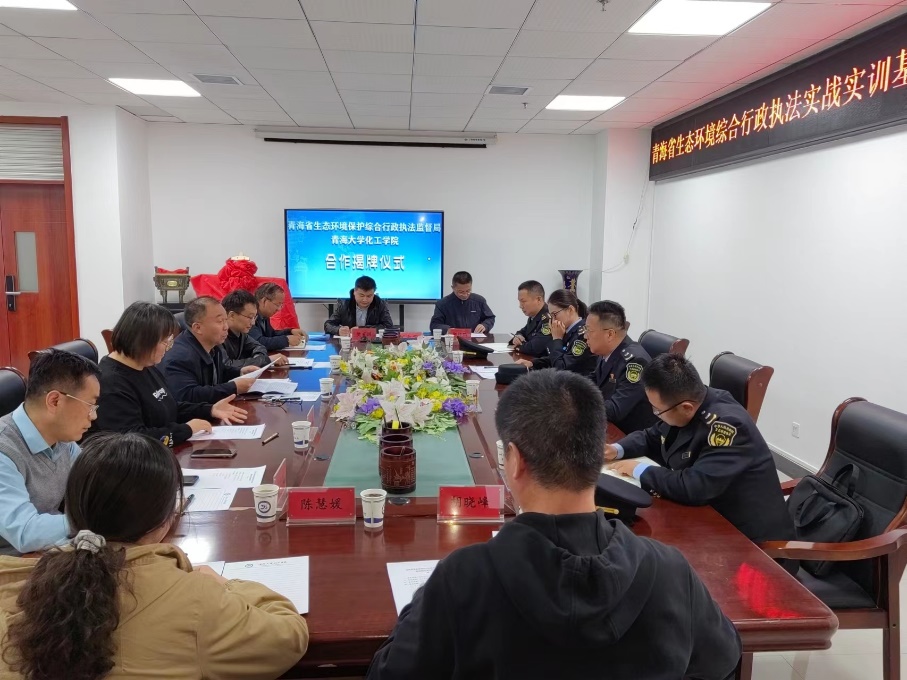 11月7日下午,狂人小说 与青海省生态环境保护综合行政执法监督局在院二楼会议室举行政校合作签字、揭牌仪式。青海省生态环境保护综合行政执法监督局局长余全盛、综合科科长姜焕、监督一科科长田炜、法规科科长王聪,学院院长刘大欢、常务副院长王晓、副院长赵启文、王宁峰、院办公室主任樊有国、教学管理部主任郭祖鹏、化机械系主任陈慧媛和环境工程教研室主任胡晓峰参加了仪式,仪式由院党委书记杨汉宁主持。